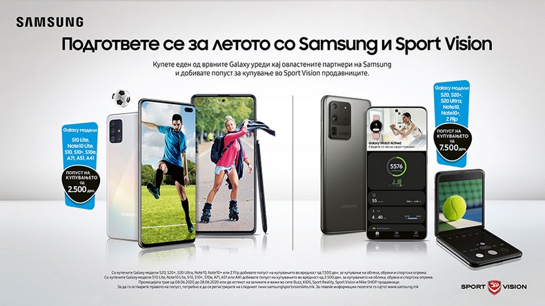 Доколку во овој период купите еден од популарните модели на Samsung Galaxy, S20, S20+, S20 Ultra, Note10, Note10+ или Z Flip, добивате ваучер со попуст на купувањето во вредност од 7.500 ден за купување на облека, обувки и спортска опрема во Sport Vision и Sport Vision KIDS продавниците, како и online на www.sportvision.mk.