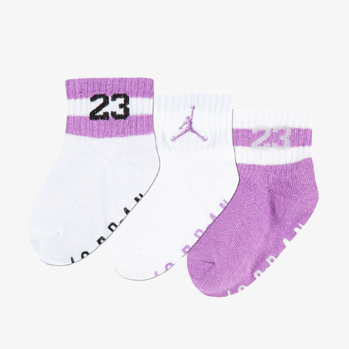 JORDAN QUARTERR се детски унисекс кратки чорапи за бебиња. Чорапите се изработени од мек памучен материјал, а на долната страна има силиконски додатоци кои обезбедуваат дополнителна безбедност при првите чекори. Совршени се за носење во креветче или количка Спецификации: