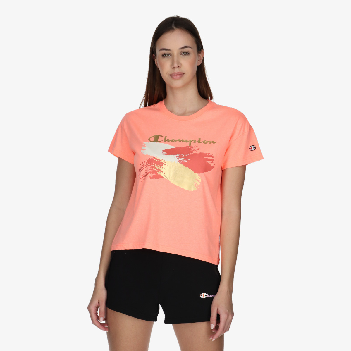 Champion Shiny е женска lifestyle маица со кратки ракави и опуштен крој. Маица која совршено се вклопува во секој ваш ден. Неверојатната удобност ќе ве освои уште при првото носење. Суптилното брендирање со привлечна графика на предната страна овозможува лесно вклопување и го прави ова парче ефектно. Широкиот крој ќе ве направи опуштени и удобни во секоја ситуација.